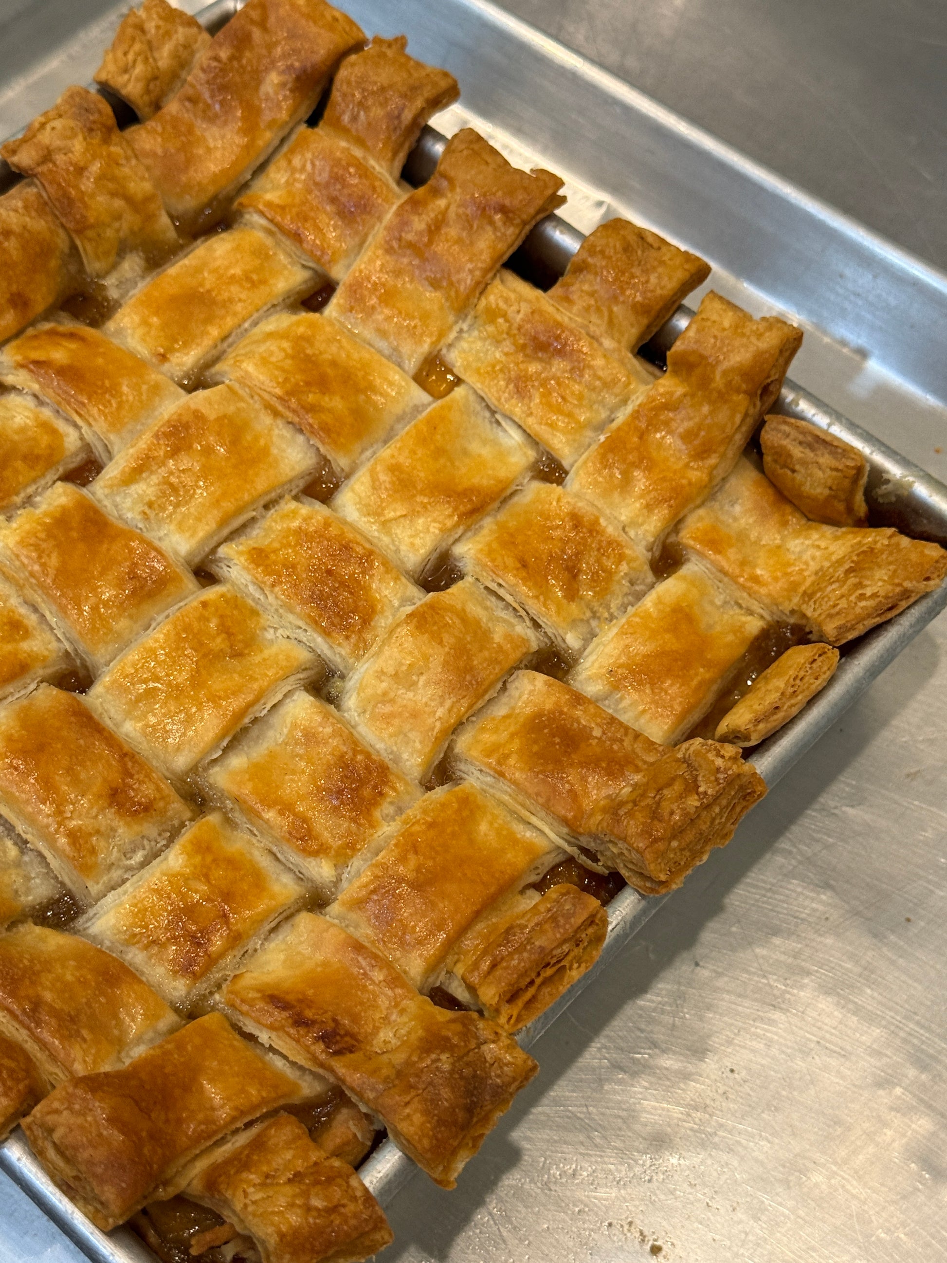 Sliced, braised peaches with a handmade crust and lattice crust on top!